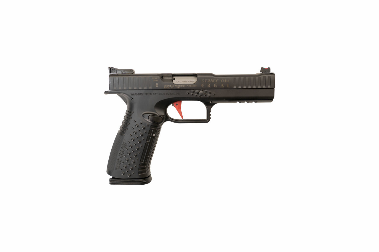 The “Strike One“ is a caliber 9mm polymer and ergal–framed semi–automatic pistol that is renowned for being the fastest gun on the planet. Its main features include: the lowest barrel ever created in a gun for reduced vertical recoil between shots, the Patented Speed Lock System for fast shooting cycling, a lightweight construction, and an ergonomic grip for comfortable handling. The Strike One Ergal features a full aluminum frame, Adjustable Fiber Optics Sights as well as a Flate Face Competition Trigger.