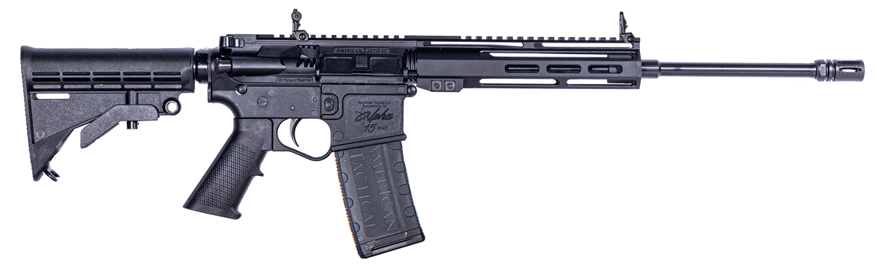 American Tactical Alpha-15 223 Rem/5.56mm, 16″ Pencil Profile Barrel, 1:8 Twist, Matte Black, Collapsible Stock, Flip Up Sights, M-Lok, 30rd