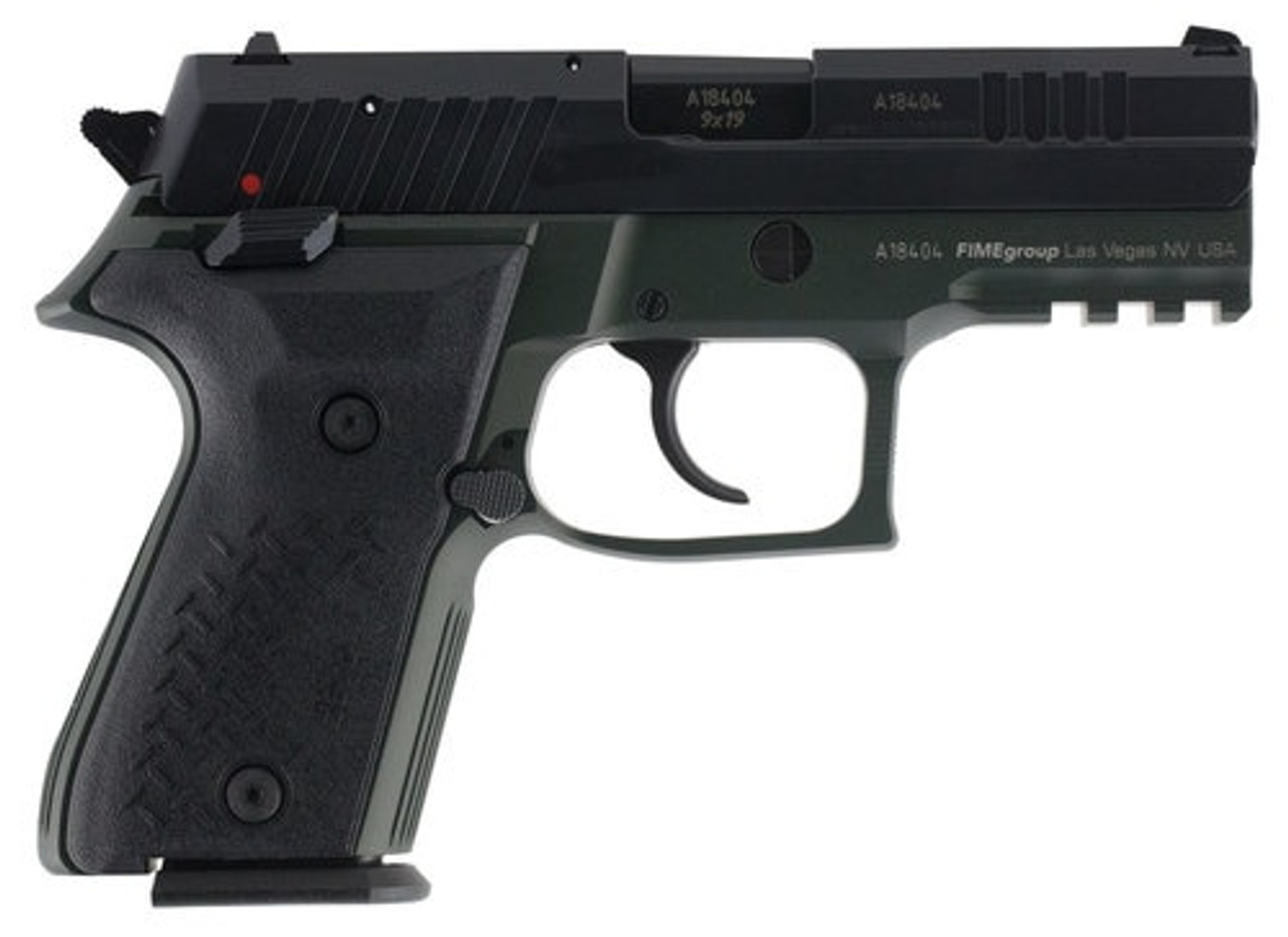 This compact size model has a 3.85″ barrel, OD green frame with black polymer grips and a black slide. It has a 15-round magazine.