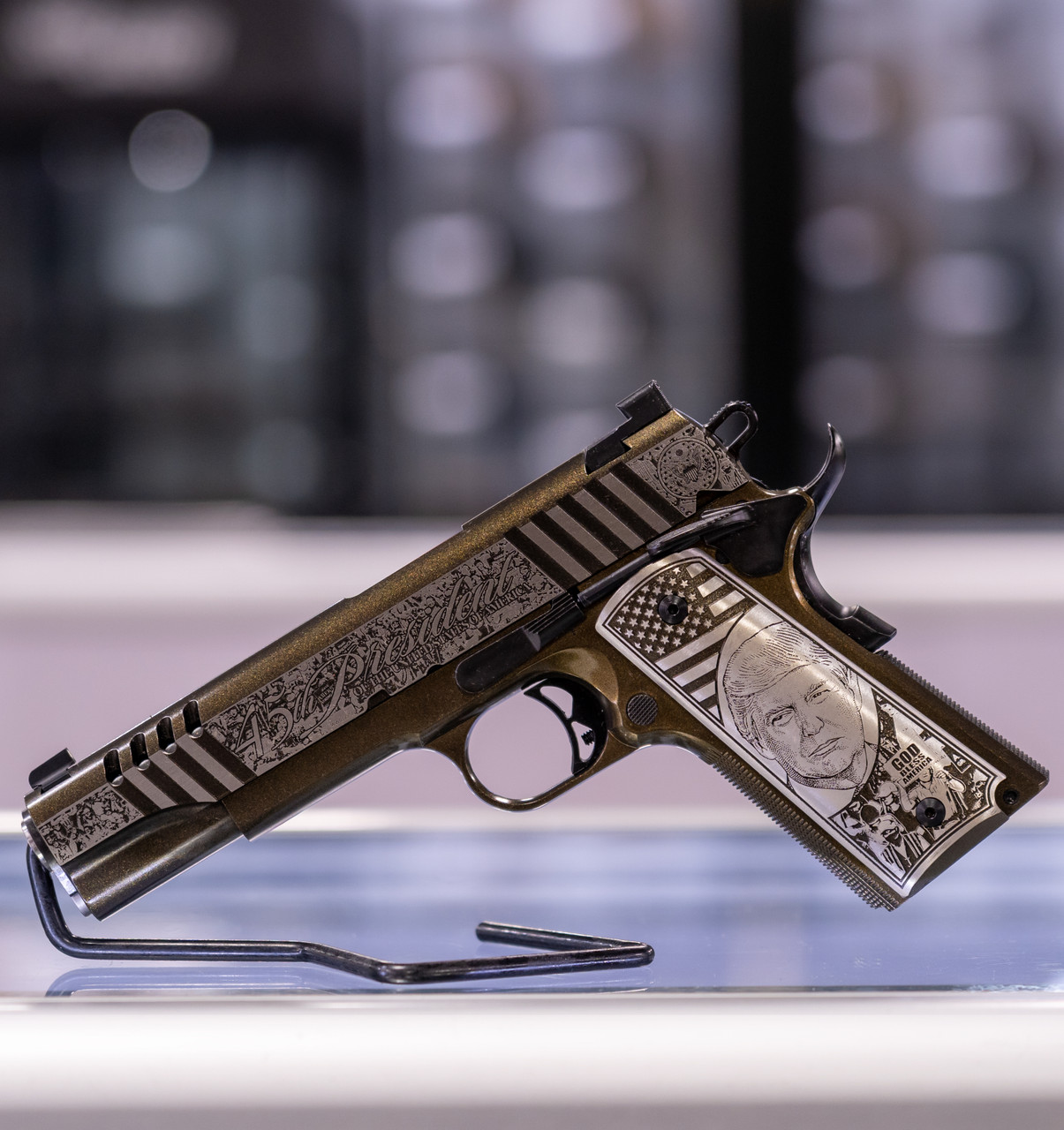 Trump “Rally Cry” 1911, Stainless Steel frame and slide, checkered frontstrap, .45 cal, 5″ barrel, aluminum engraved grips, slide and grip is custom engraved with actual Trump rally scenes, “45th President” and “Donald J Trump”, finished in black Cerakote with gold flakes and a clear ceramic coating, night sights.