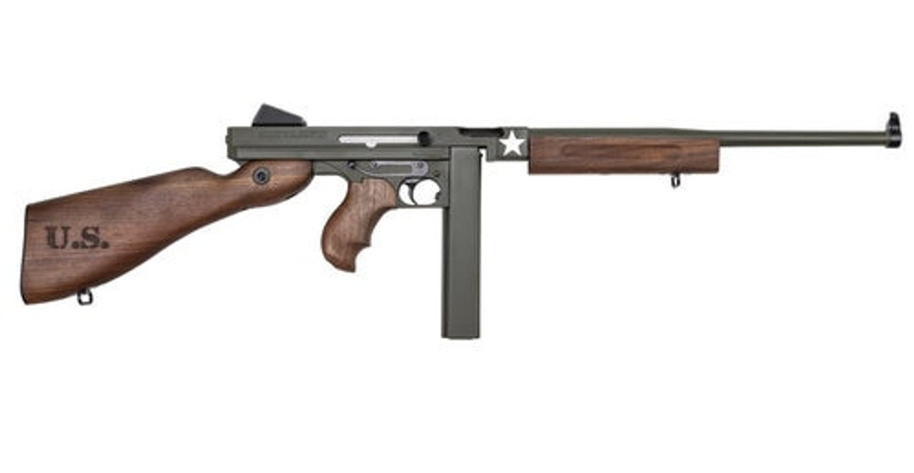 The Thompson M1 was used victoriously in battles throughout the world, inscribing its place for all times as a legend among military firearms. The M1 Carbine “Tanker Thompson” dedicated to the memory of the brave American soldiers who faced the enemy in steel chariots like the M4 Sherman Tank. Auto-Ordnance is proud to honor America’s armored warriors with this commemorative Thompson. Each Tanker Thompson is cerakoted in Army O.D. Green. The white star of the Sherman Tank is engraved just in front of the magwell. The “U.S” logo is engraved on the buttstock. This model is all steel with high grade walnut furniture. The 16.5″ barrel is exceptionally accurate.