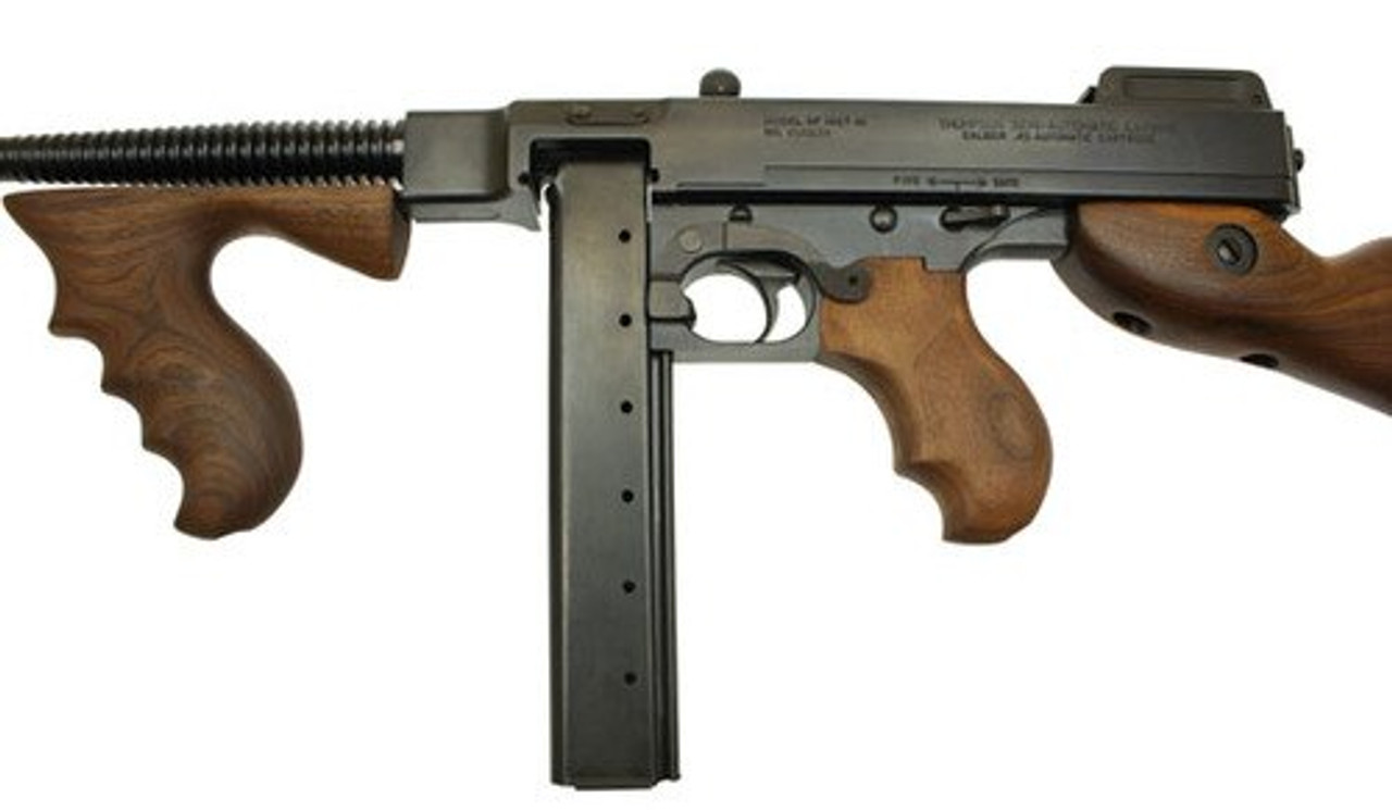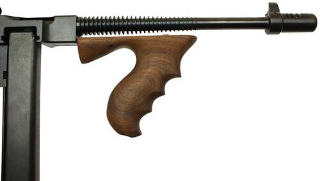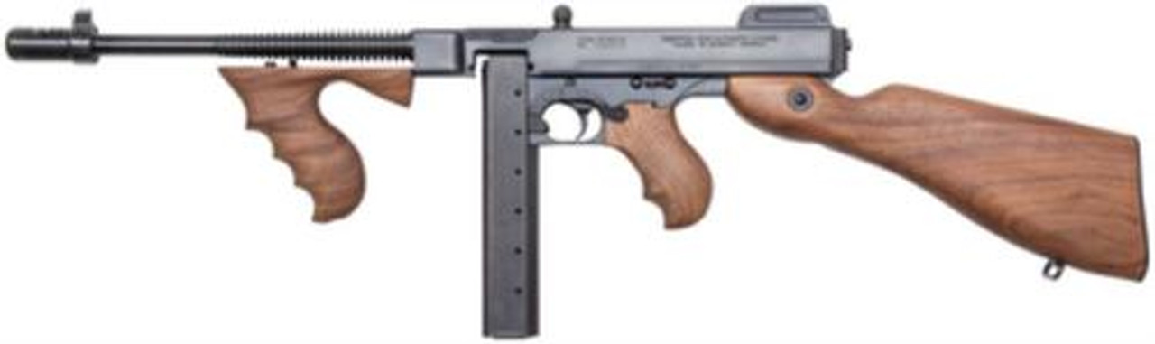 This is the original Thompson design made famous during the 1920’s in hands of the gangsters and G-men. The operation is semi-auto, and fires from a closed bolt. The barrel is 10.5″ long. The frame and receiver are machined from solid steel and the stock is genuine walnut. The finish is blued steel.