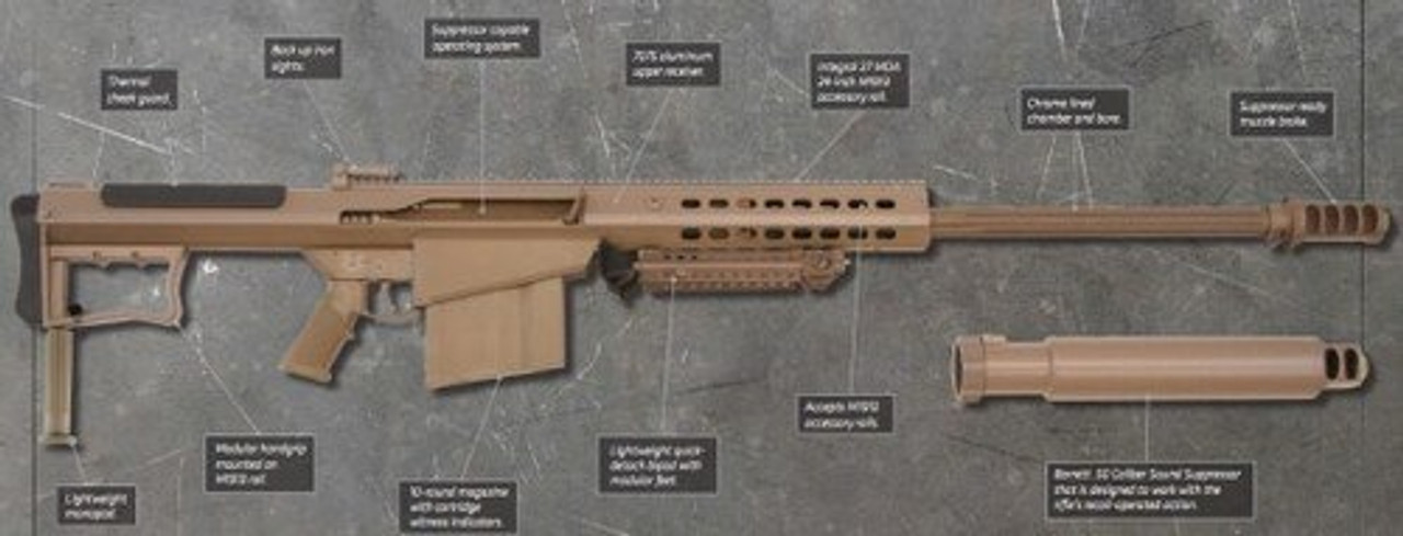 Designed for use with the Barrett M107A1 rifle – which is suppressor-ready. The M107A1’s titanium four-port muzzle brake is engineered to work seamlessly with this quick-attach Barrett .50 BMG Suppressor.
