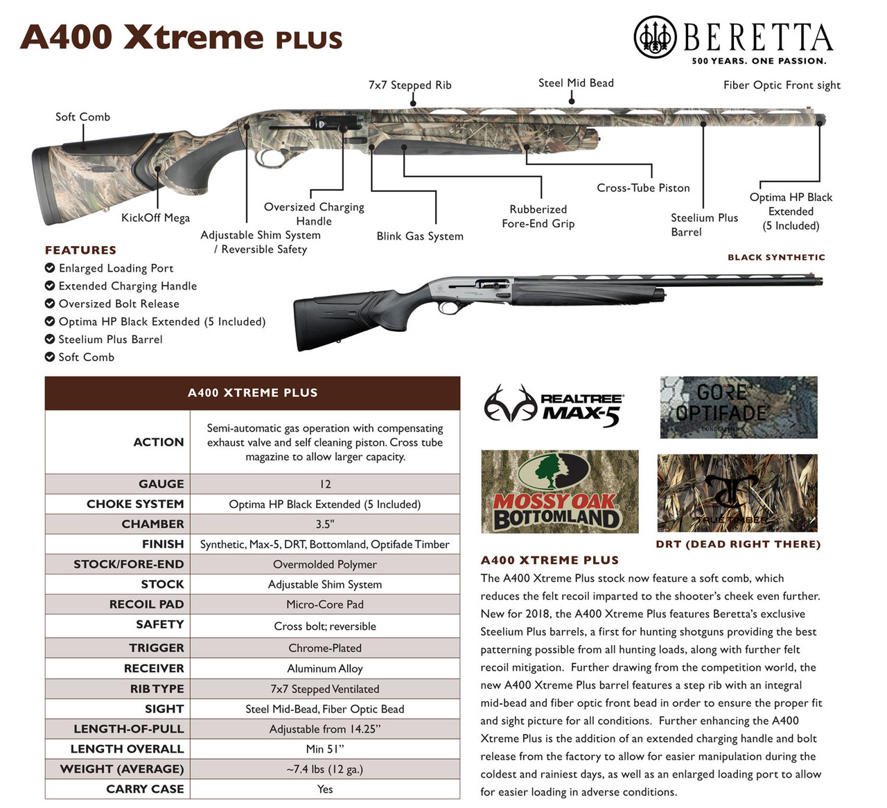 Beretta’s A400 Xtreme semiauto shotgun is ideal for upland or waterfowl hunting as well as target shooting. The action gives fast follow-up shots and is equipped with built-in rails, so you can easily mount optics. The unique Blink technology, shoots 36 percent quicker than any other type of semiauto shotgun. Its synthetic stock combines Beretta’s Kick-Off system with an ultra-soft Micro-Core butt-pad, to minimize recoil and is designed to recoil parallel to the cheek mount. The OptimaBore HP barrel’s finish offers superior resistance to the elements, including water, powder, sand and salt spray. The A400 Xtreme Plus features Beretta’s exclusive Steelium Plus barrel, providing the best patterning possible from all hunting loads, along with further felt recoil mitigation. The barrel also utilizes a step rib with an integral mid-bead and fiber optic front bead, and lengthened forcing cones. Its stock features a soft comb, which reduces the felt recoil imparted to the shooter’s cheek even further. The A400 Xtreme Plus also has an enlarged loading port, extended charging handle and bolt release, and Aqua Technology which is a protective coating to withstand the harshest elements.