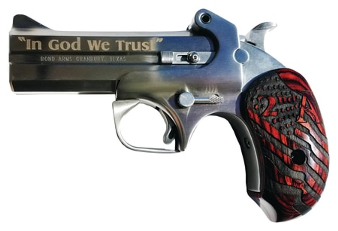 Protect the 2nd Amendment features a 4.25 inch barrel to provide a tighter shot pattern, higher velocity and more manageable recoil. Will accept all the extra interchangeable barrels. Extended rosewood grip for added comfort. Front blade and fixed rear sights. Stainless steel double-barrel and frame. Automatic spent casing extractor. Retracting ring pins. Cross-bolt safety. Spring-loaded, cammed locking lever. Includes BAD premium leather driving holster.