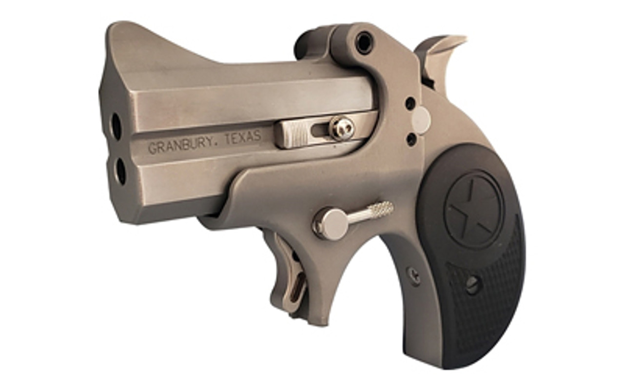 This Bond Arms Rawhide has a stainless metal finish, black rubber grips, and a crossbolt safety; shoots 22 LR.