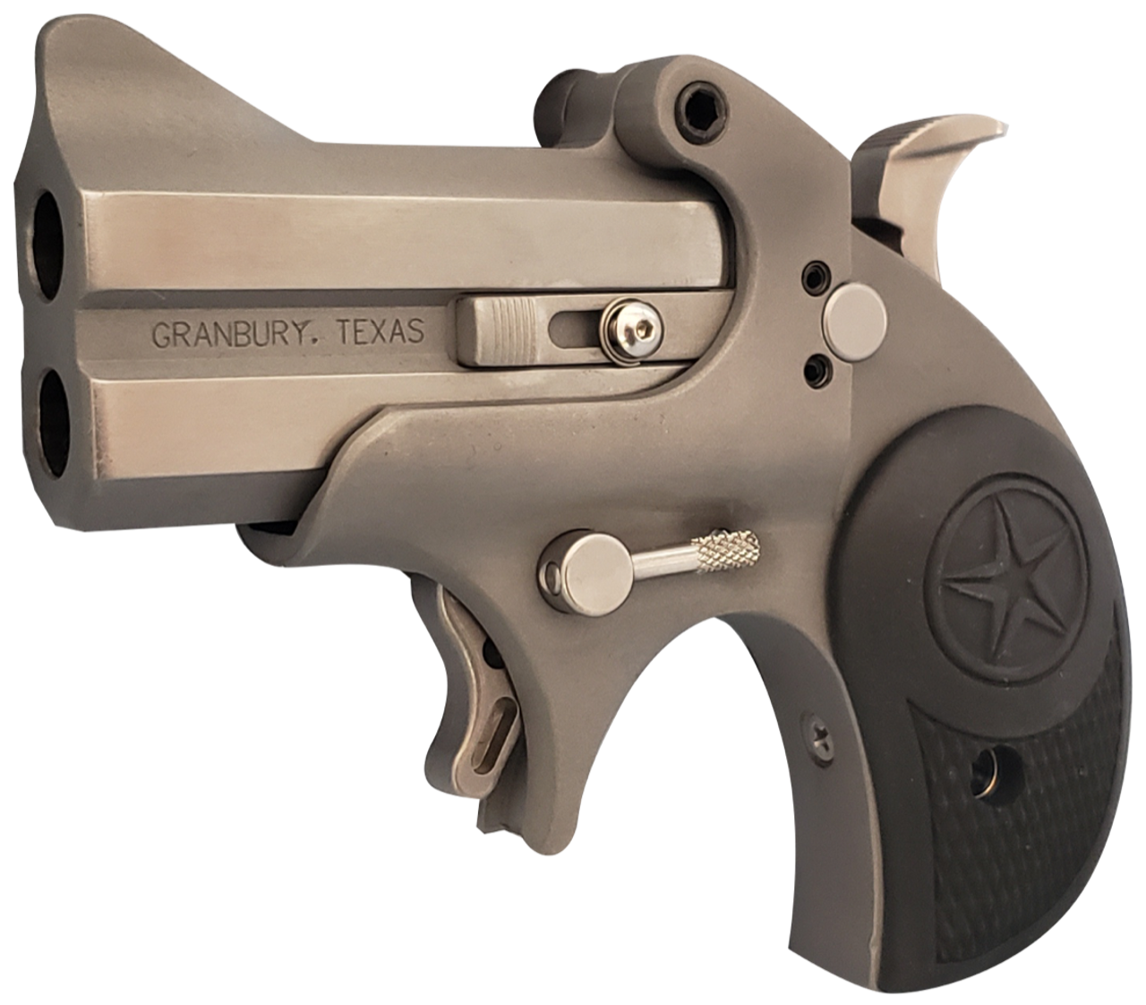 This Bond Arms Rawhide has a stainless metal finish, black rubber grips, and a crossbolt safety; shoots 357 Mag & 38 Special.