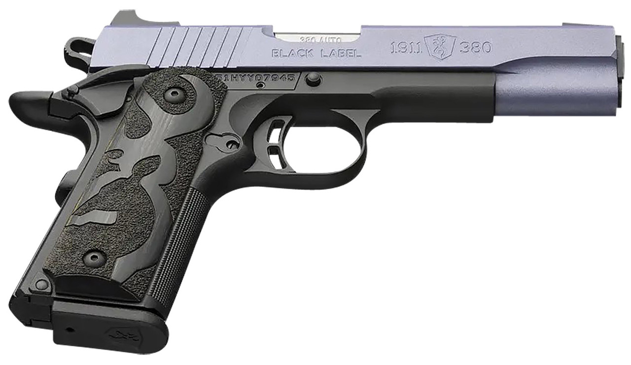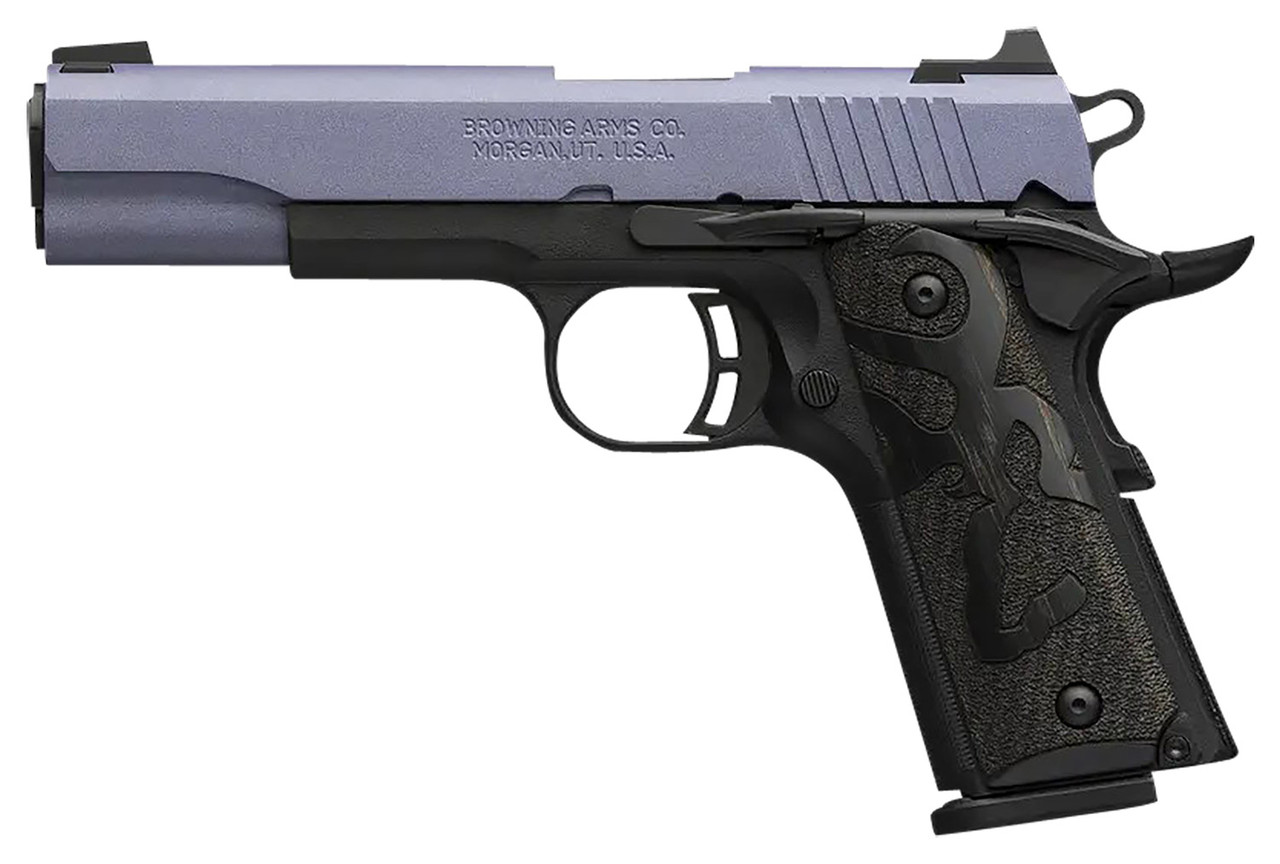 Browning 1911-style, autoloading 380 ACP pistol with Crushed Orchid Cerakote finish on the aluminum alloy slide. Metal 3-dot sights, black stippled laminated wood grips with Buckmark. 4-1/4″ barrel length. Lightweight composite frame with aluminum sub-frame.