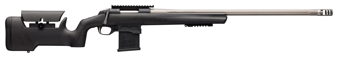 A Browning bolt-action rifle optimized for long-range target shooting and competition. Features include a stiffer, heavier receiver, fluted stainless steel barrel with Recoil Hawg muzzle brake on 5/8″-24 suppressor-ready threads, adjustable Target DLX trigger, extended bolt handle and adjustable MAX composite stock.