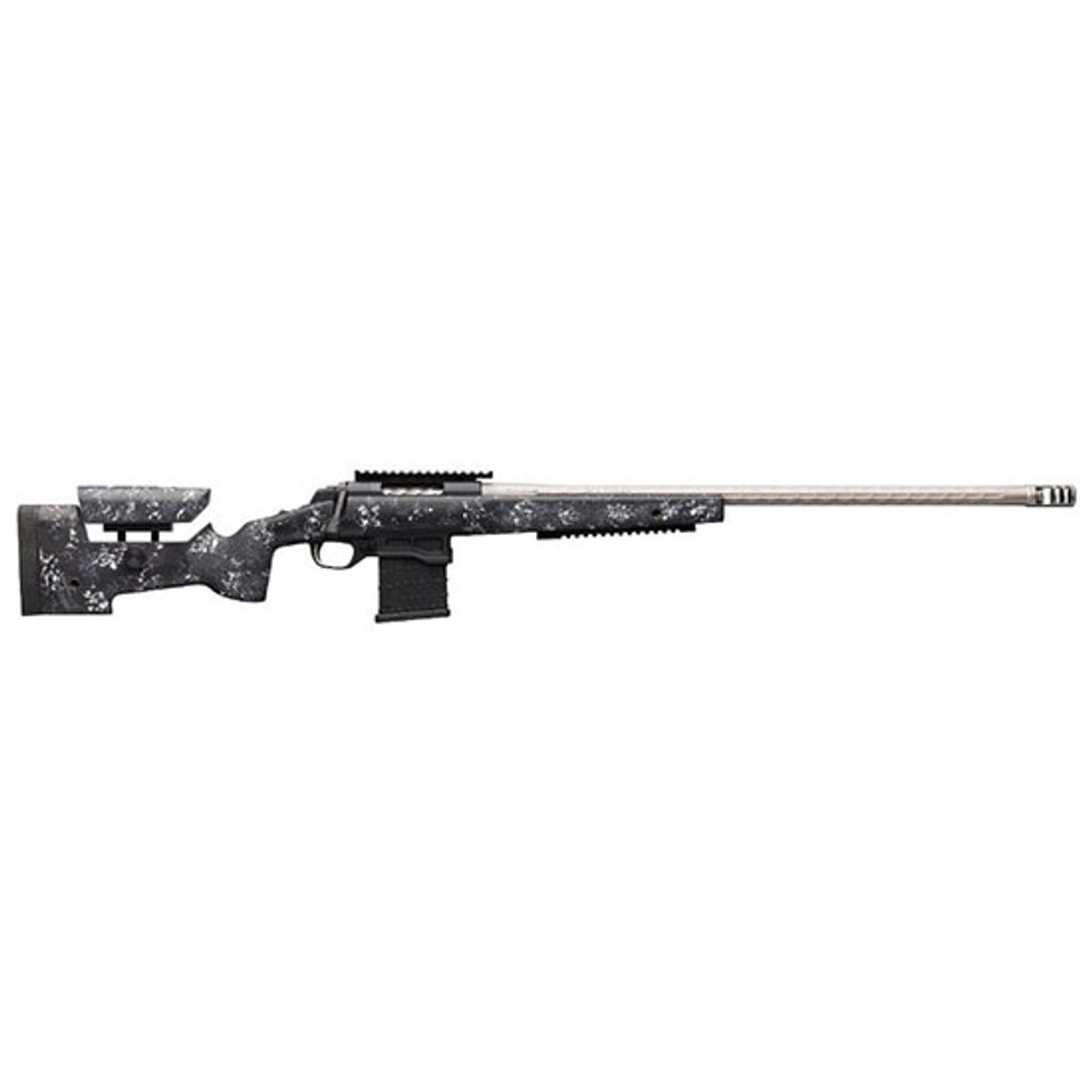 A Browning bolt-action rifle optimized for long-range target shooting and competition. Features include a stiffer, heavier receiver, fluted stainless steel barrel with Recoil Hawg muzzle brake on 5/8″-24 suppressor-ready threads, adjustable Target DLX trigger, extended bolt handle and adjustable McMillan A3-5 carbon fiber stock.