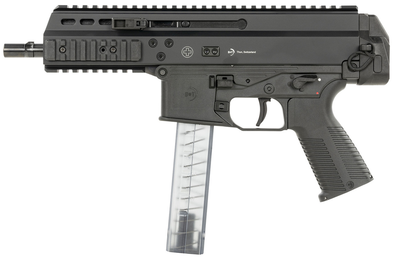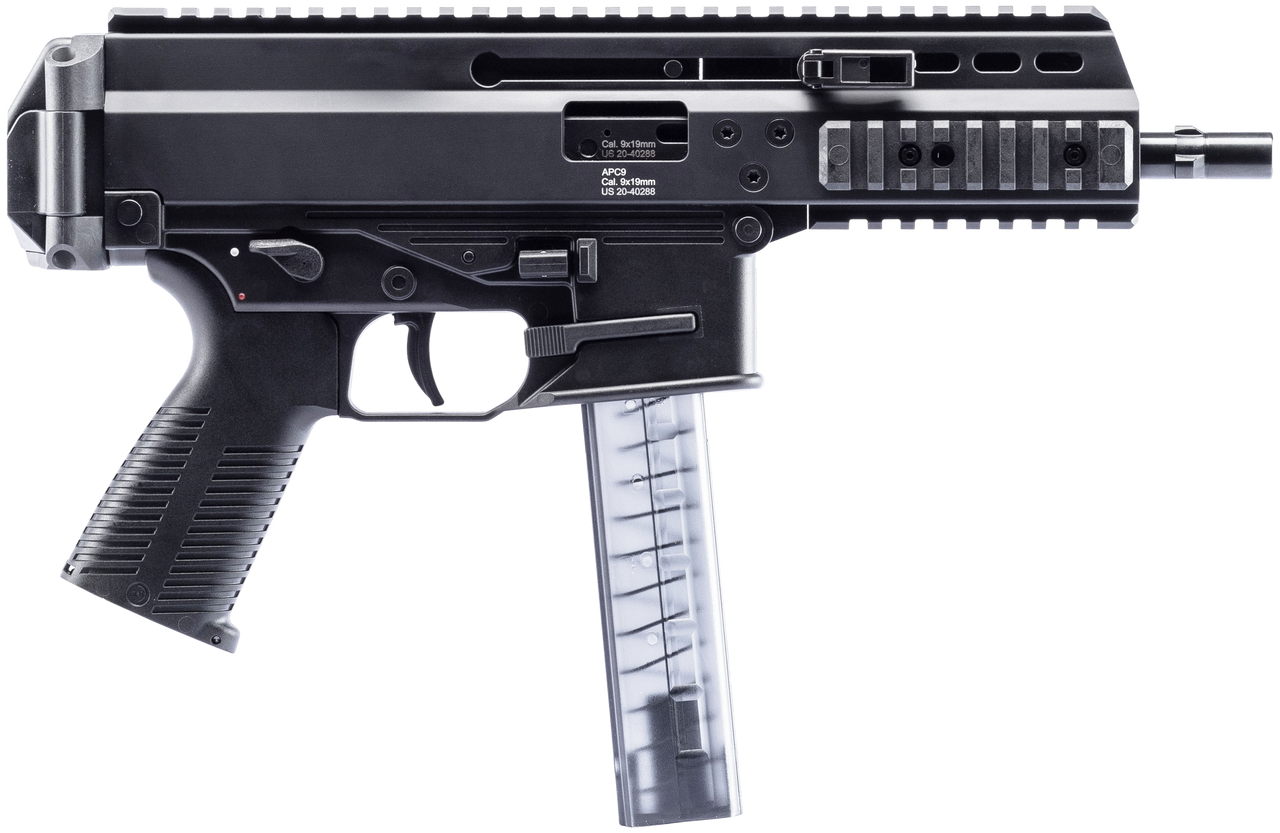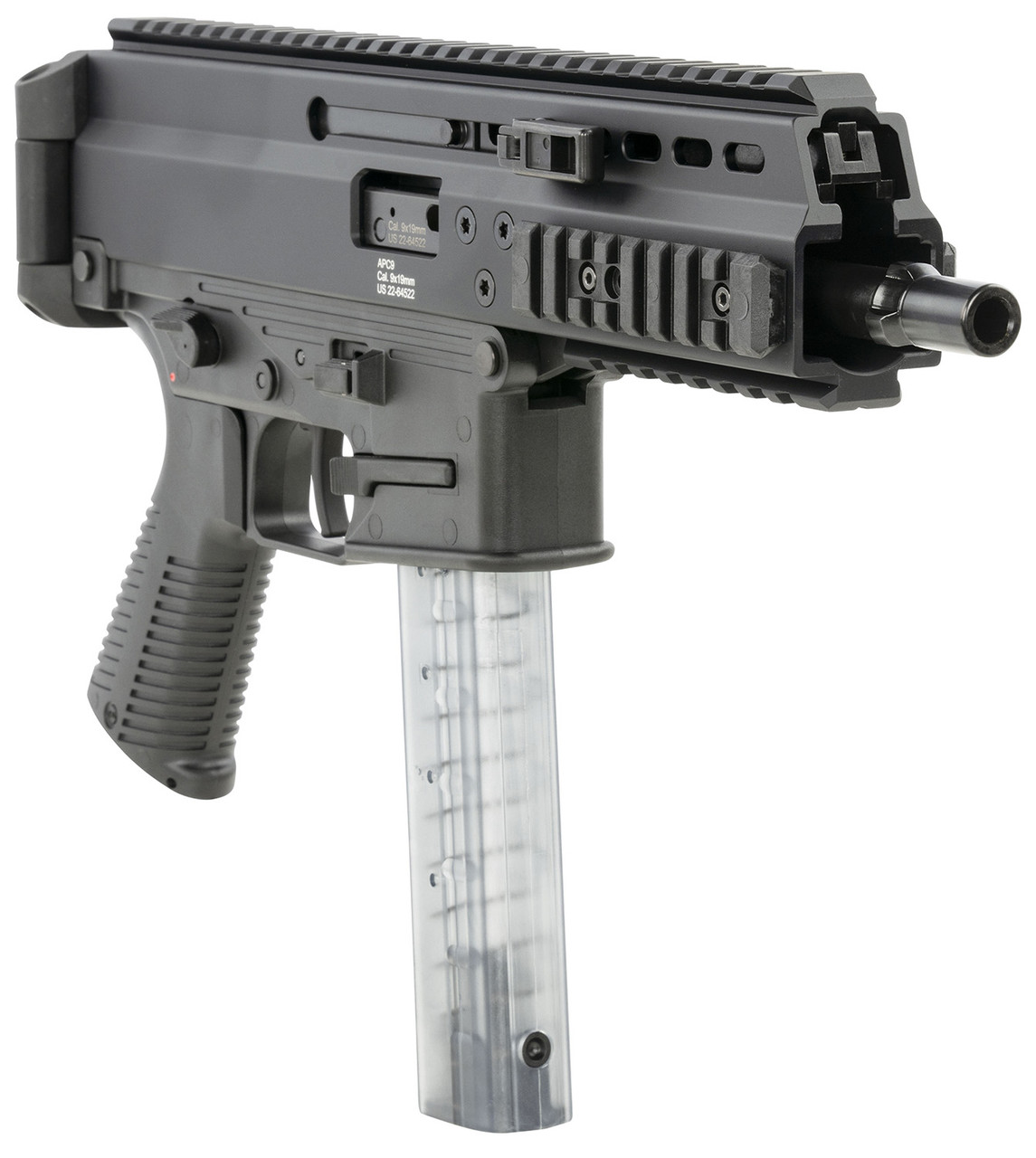 The APC PRO series brings a new level of performance and adaptability to the APC platform. All models feature a dual auto-folding, non-reciprocating charging handle, improved lower receiver ergonomics including a side positioned bolt hold open/release, removable M4 compatible grips, and Magpul M-Lok accessory slots. The APC9 ships as a pistol.