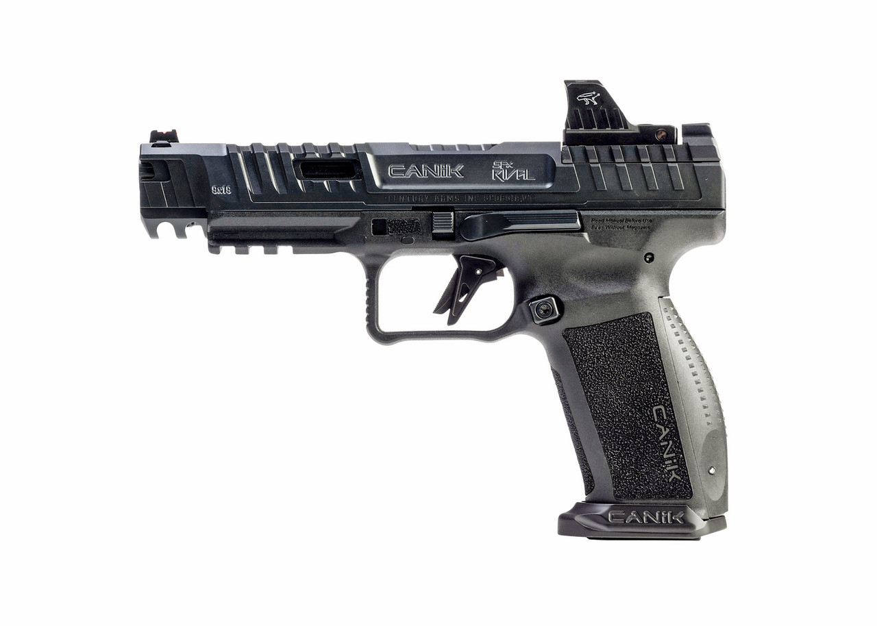 The Canik SFx Rival has a total length of 8.1,, a height of 5.7,, a 1.41, width, a 5, barrel, and an overall weight of 29.5 oz. With these specifications the Canik SFx Rival can compete in IDPA, IPSC, and USPSA without restrictions. The Canik Rival is available in Canik Rival Grey with Cerakoted gold accents and in an all-black configuration called the Canik SFx Rival Dark Side. With adjustable fiber optic sights, a lightened 90 degree diamond cut aluminum flat trigger, reversible magazine releases and sizes, ambidextrous slide release, aggressively serrated and ported slide, 1913 Picatinny rail, external mag-well, 3 grip back strap sizes, double undercut trigger guard, ergonomically redesigned beavertail, aggressive grip texturing, and a completely modular setup, the SFx Rival is ready to win right out of the box!