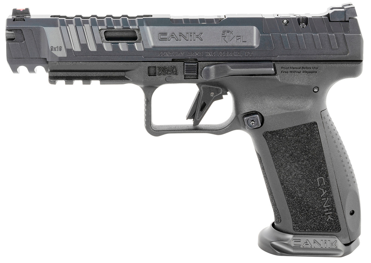 The Canik SFx Rival has a total length of 8.1,, a height of 5.7,, a 1.41, width, a 5, barrel, and an overall weight of 29.5 oz. With these specifications the Canik SFx Rival can compete in IDPA, IPSC, and USPSA without restrictions. The Canik Rival is available in Canik Rival Grey with Cerakoted gold accents and in an all-black configuration called the Canik SFx Rival Dark Side. With adjustable fiber optic sights, a lightened 90 degree diamond cut aluminum flat trigger, reversible magazine releases and sizes, ambidextrous slide release, aggressively serrated and ported slide, 1913 Picatinny rail, external mag-well, 3 grip back strap sizes, double undercut trigger guard, ergonomically redesigned beavertail, aggressive grip texturing, and a completely modular setup, the SFx Rival is ready to win right out of the box!