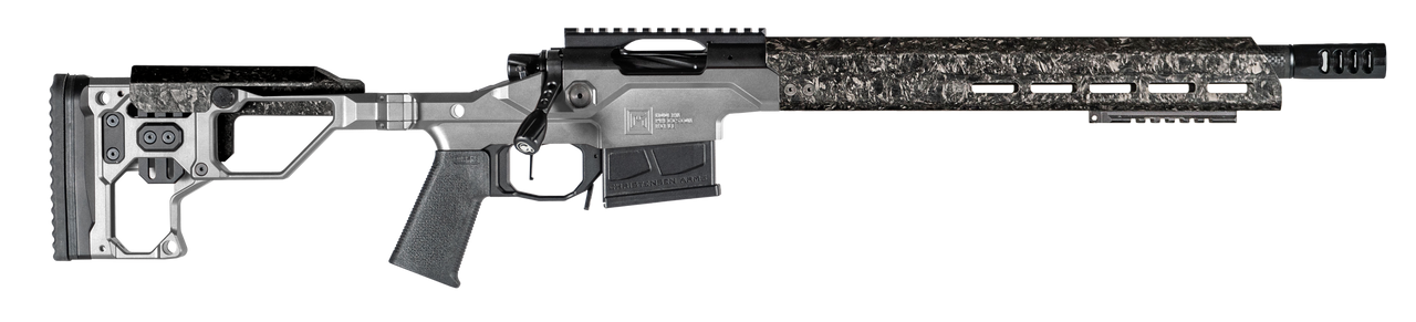 The Modern Precision Rifle is an ultra-lightweight chassis rifle designed to break with tradition. Beyond the folding stock the complete package is well equipped with a target contour Christensen Arms carbon fiber barrel, carbon fiber comb, free-floating carbon fiber handguard, and 20 MOA rail. The action and stainless steel side-baffle muzzle brake are finished in Black Nitride for a sleek look. The Modern Precision Rifle weighs in starting at 6.9 pounds and is backed by the Christensen Arms Sub-MOA Guarantee.