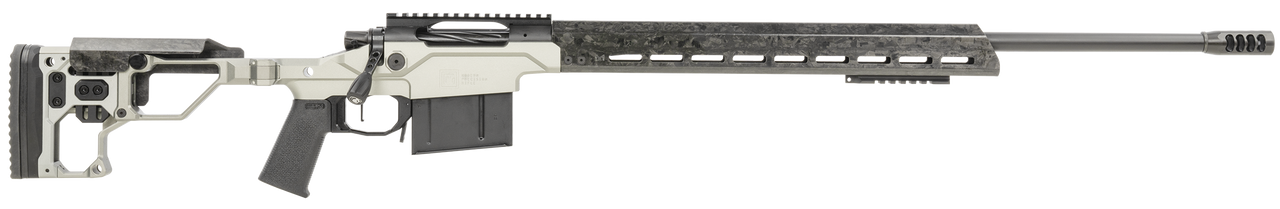 The Modern Precision Rifle is an ultra-lightweight chassis rifle designed to break with tradition. Beyond the folding stock the complete package is well equipped with a target contour Christensen Arms carbon fiber barrel, carbon fiber comb, free-floating carbon fiber handguard, and 20 MOA rail. The action and stainless steel side-baffle muzzle brake are finished in Black Nitride for a sleek look. The Modern Precision Rifle weighs in starting at 6.9 pounds and is backed by the Christensen Arms Sub-MOA Guarantee.