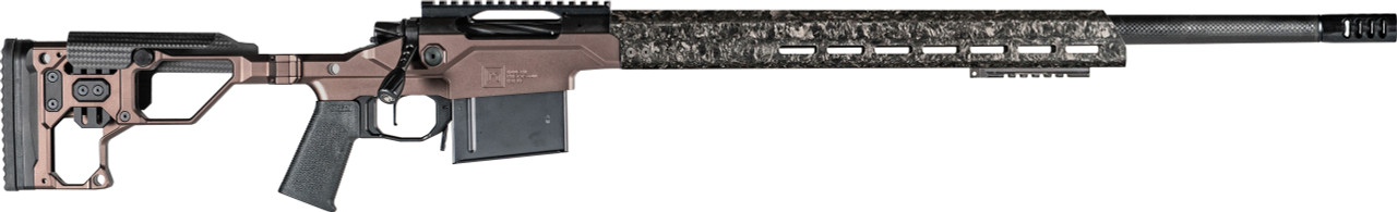 The Modern Precision Rifle is an ultra-lightweight chassis rifle designed to break with tradition. Beyond the folding stock the complete package is well equipped with a target contour Christensen Arms carbon fiber barrel, carbon fiber comb, free-floating carbon fiber handguard, and 20 MOA rail. The action and stainless steel side-baffle muzzle brake are finished in Black Nitride for a sleek look. The Modern Precision Rifle weighs in starting at 6.9 pounds and is backed by the Christensen Arms Sub-MOA Guarantee.
