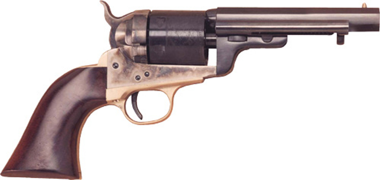 Patented July 2, 1872, Colt employees Charles B. Richards and William Mason, combined their ideas for converting Colt’s percussion revolvers to self-contained metallic cartridge, breech loading arms. Originally working with the percussion arms parts already in stock, guns were converted, however as they began to run out of the cap and ball components, the company began producing new sixguns as metal cartridge arms, rather than conversions. Although the numbers produced only amounted to a few thousand specimens (around 2,100 1860 Army models and about 3,800 1851 Navy models). El Paso’s city marshal Dallas Stoudenmire packed a cut down Richards-Mason Army Colt. and John H. “Doc” Holliday packed a ’51 new-made Navy model. Today’s shooters enjoy the looks and handling capabilities of these conversion revolvers that combine the sleek lines of percussion revolvers with the convenience of self-contained cartridge sixguns. Due to the high cost and scarcity of originals, Cimarron’s Richards-Mason conversions are ideal for Cowboy Action competitors as well as nostalgic gun buffs alike. The Army model, copied from an original in our antique collection, sports a Standard Blue finish, while Cimarron’s Navy model wears a Black finish. Both models are offered in a choice of .45 Colt, .44 Colt and Russian, .38 Colt/Special, or .45 Schofield caliber, and in either a 5 1/2-inch barrel or the 8-inch barrel length. In the Original Finish, antique arms enthusiasts will swear you have the “gen-u-wine” article!