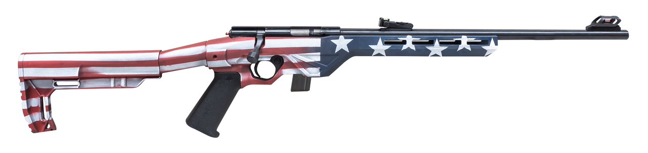 The Citadel Trakr features an 18″ blued barrel and black metal finish. This model has an American Flag Stock