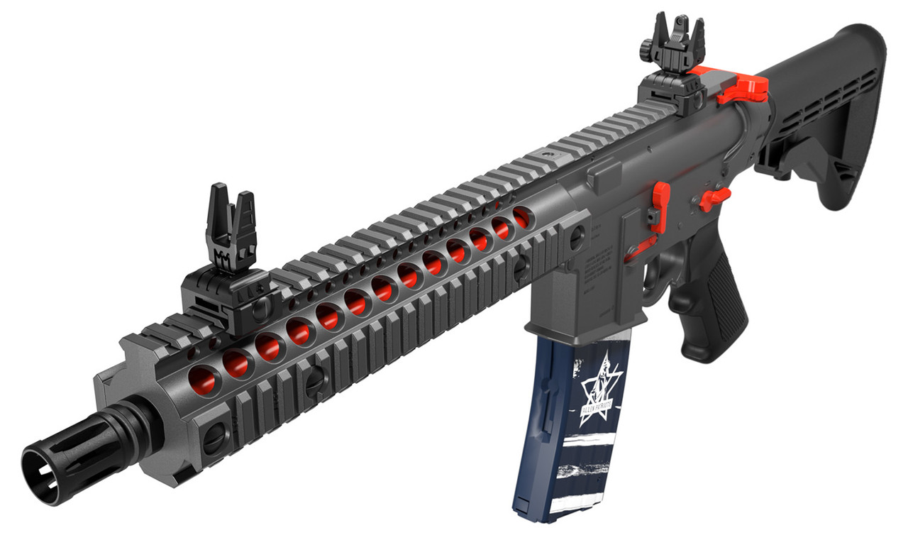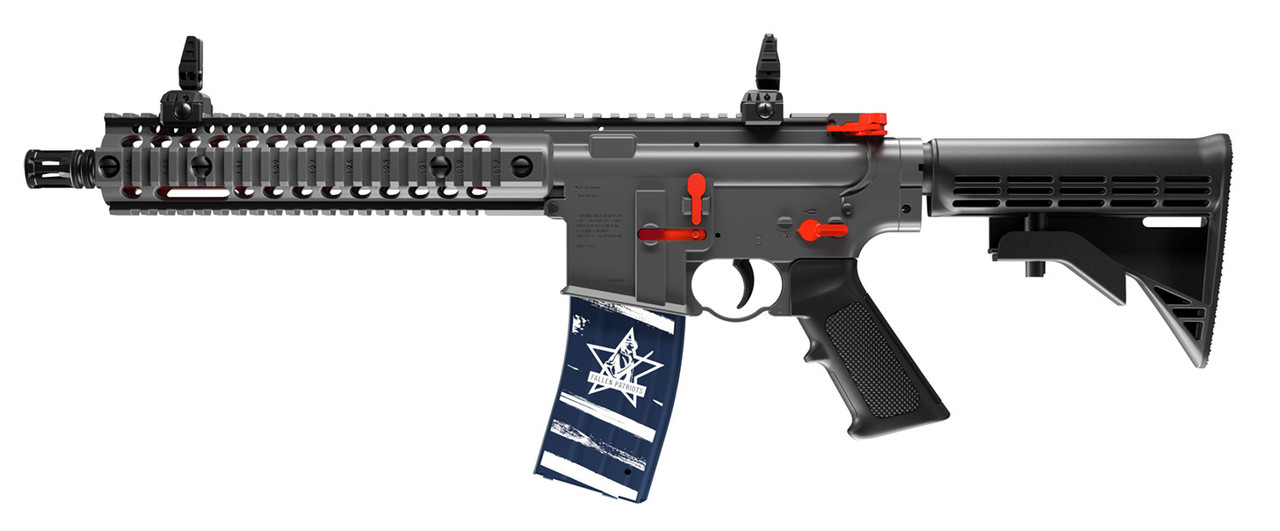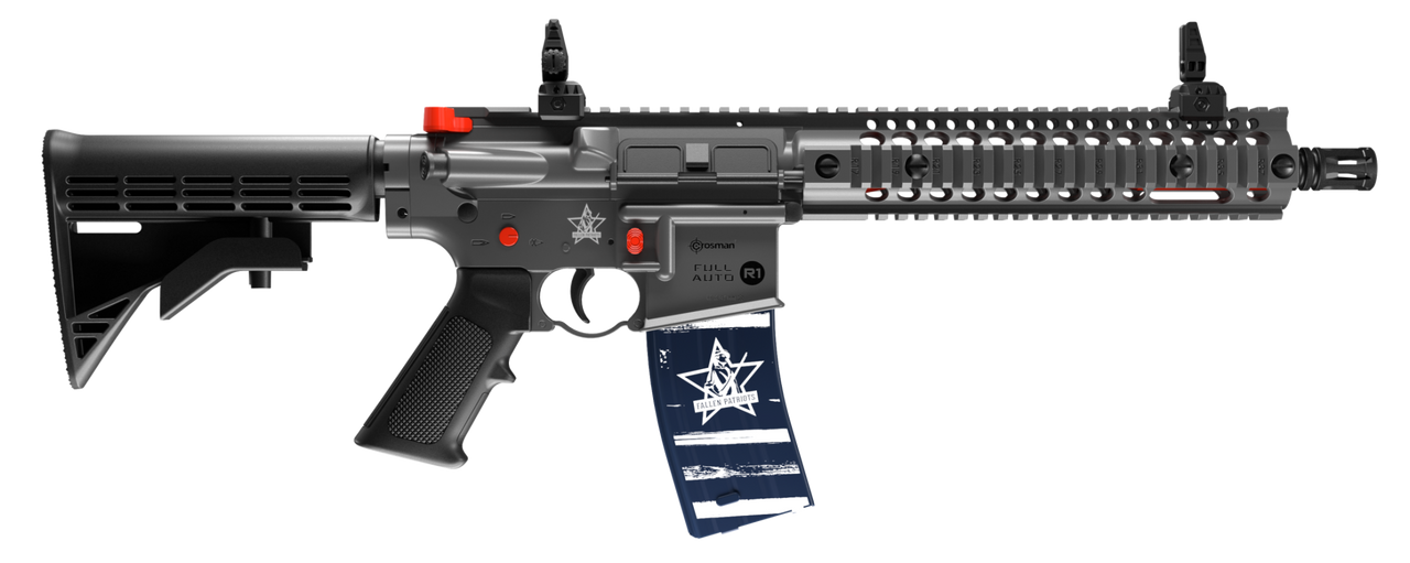 This limited edition Crosman Full Auto R1 pays tribute to the Children of Fallen Patriots Foundation. Crosman will give a portion of the proceeds to this foundation. This BB air rifle is fueled by two 12-gram CO2 cartridges and a 25 round drop-out magazine, you will have target cans flying in no time. Outfitted with a stealth gray stock and color highlights that red metal component and custom dark blue magazine for an exciting and patriotic look. The rifle features a genuine feel, familiar controls, and an intense 1400 round per minute rate of fire, all at a jaw-dropping rate of up to 430 fps. Even better, the rifle is fully customizable with a 6 position adjustable stock, AR-compatible buttstock/pistol grip, a Picatinny rail that provides endless accessory mounting opportunities and a bonus CFPF branded morale patch.