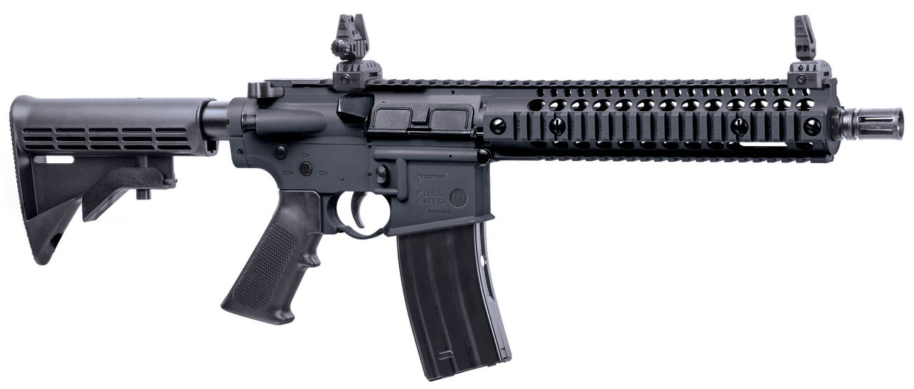 The Crosman Full Auto R1 BB air rifle maximizes backyard fun! Fueled by two 12-gram CO2 cartridges and a 25 round drop out magazine, you will have target cans flying in no time. The rifle features a genuine feel, familiar controls and an intense 1400 round per minute rate of fire, all at a jaw dropping rate of up to 430 fps. Even better, the rifle is fully customizable with a 6 position adjustable stock, AR compatible buttstock/pistol grip and a Picatinny rail that provides endless accessory mounting opportunities. Stay on target with the included rail mounted red light laser sight and “Take it Outside” with Crosman.