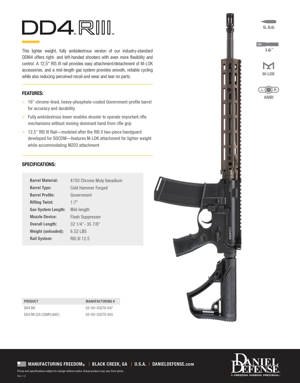 This lighter weight, fully ambidextrous version of their industry-standard DDM4 offers right- and left-handed shooters with even more flexibility and control. A 12.5, RIS III rail provides easy attachment/detachment of M-LOK accessories, and a mid-length gas system provides smooth, reliable cycling while also reducing perceived recoil and wear and tear on parts.