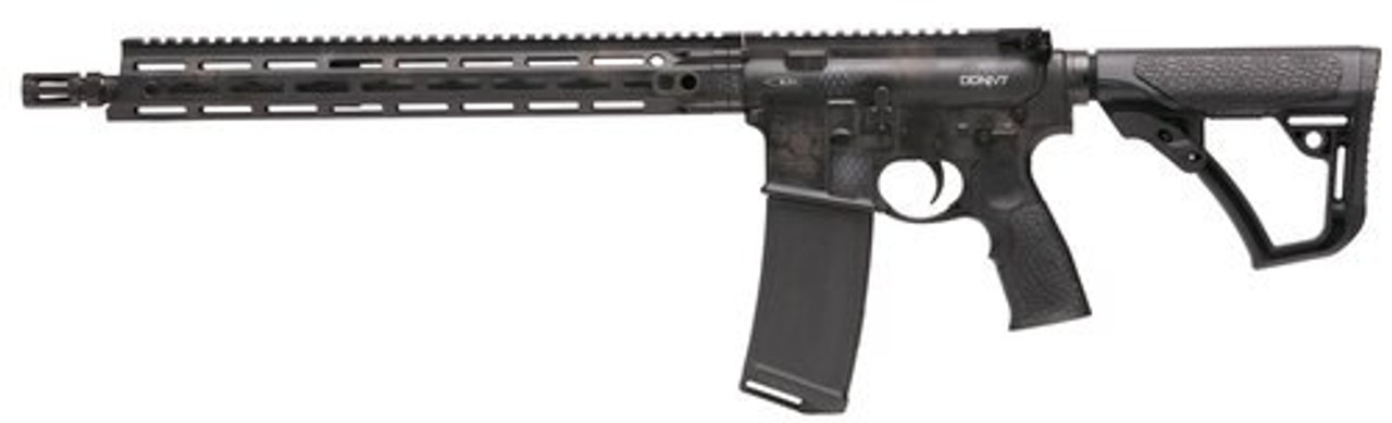 This Co-compliant 5.56 model has a 16″ barrel and Daniel Defense Rattlecan finish a hybrid paint scheme which blends Daniel’s proprietary Tornado and Mil Spec + Cerakote finish.