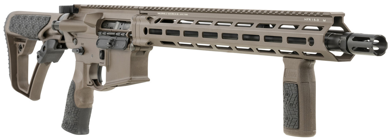 The Daniel Defense V7 is the first rifle in the DDM4 lineup to feature the M-LOK attachment technology with the Daniel Defense MFR XS 15.0 rail. Built around a cold hammer forged barrel, it has a DD improved flash suppressor to reduce flash signature. The mid-length gas system provides smooth and reliable cycling under any condition and reduces both perceived recoil and wear on moving parts. A free-floating MFR XS 15.0 hand-guard offers incredible weight savings as well as superior cooling, ergonomics, and modularity while maintaining the strength and durability expected from Daniel Defense. With the M-LOK attachment points that run along 6 positions and an uninterrupted 1913 picatinny rail on top, the V7 has plenty of room for the sights, optics, and accessories the user may require. The rifle is finished off with the rugged and comfortable Daniel Defense buttstock and pistol grip. This CO-compliant 5.56 model has a 16″ barrel and Daniel Defense Rattlecan finish; a hybrid paint scheme which blends Daniel’s proprietary Tornado and Mil Spec + Cerakote finish.