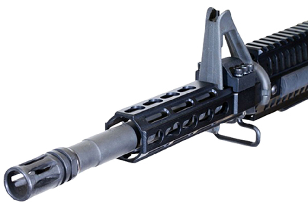 Ergo’s KeyMod Forward Rial mounts to A-2 front sights and is constructed of 6061 T-6 aluminum with a black anodize finish.
