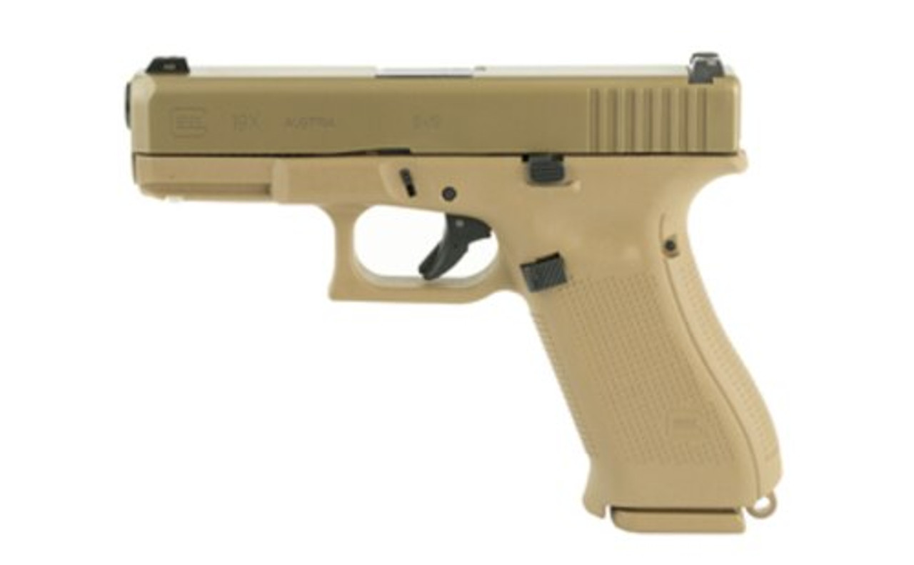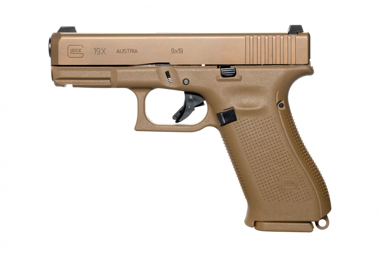 The Glock 19X now comes in a different color with the first-ever factory colored slide. The GLOCK 19X’s improved nPVD slide coating prevents corrosion, resists chemicals, and stands up to the elements. The pistol comes in coyote color and includes a standard 17-round magazine and two 17+2-round magazines along with a coyote-colored pistol case.