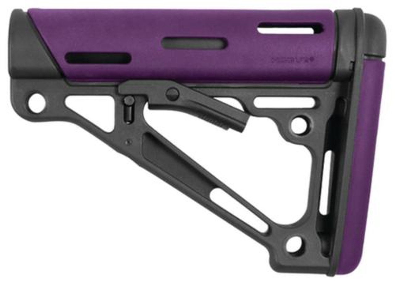 For AR-15/M16 style rifles. Overmolded collapsible buttstock. Fits mil-spec buffer tube. Purple rubber.