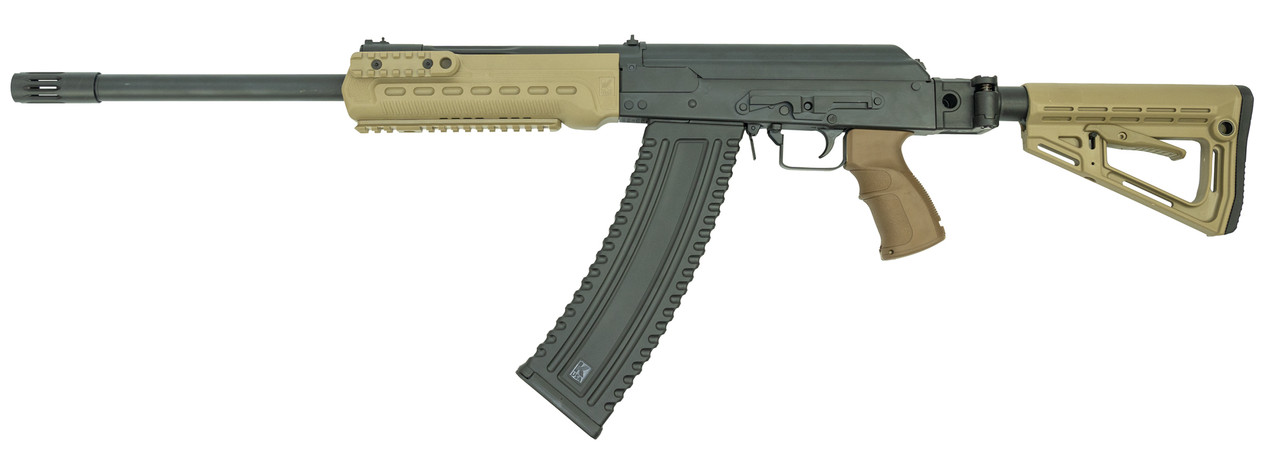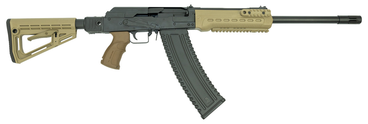 The KS-12 is a 12 GA semi-automatic shotgun based on the Russian Saiga series. It is designed to accept 2.75” and 3” shells and includes a 5 round magazine. The KS-12 has a side mounted optics rail, an AR15 style folding buttstock and a pistol grip. Most of the currently available Saiga accessories will work on the KS-12 including magazines, drums, muzzle devices and chokes Made in the USA