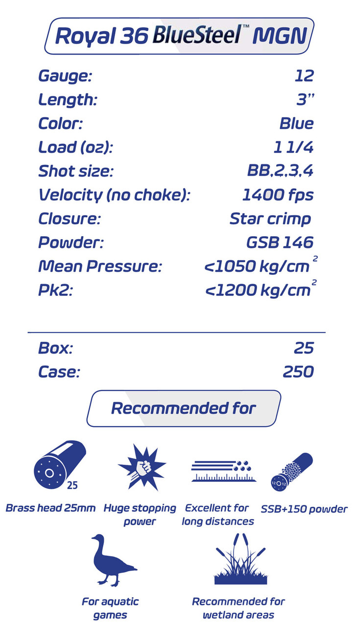 RIO’s Royal BlueSteel Game Load excels in performance with powders and cartridge wads that are specifically designed for the challenges of steel shot ensuring reliable performance and results. High velocities, perfectly spherical steel shot and multiple shot sizes give you the killing power you need under adverse hunting conditions. RIO’s Royal BlueSteel Game Load provides great patterns and superb knockdown power combined with an eye-catching steel design.