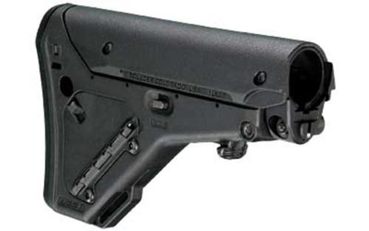 The Magpul UBR (Utility / Battle Rifle), U.S. Patent 6651371, is a fully-featured, adjustable butt stock for the AR15/M16. Unlike typical collapsing stocks, this modular design offers the stability of a fixed stock with consistent cheek weld in any position. Seven-position length-of-pull (LOP) adjustment is quickly executed with gross motor movement while the integral preset system allows direct access to a preferred position. A robust lock mechanism and multi-shell construction increase durability under severe impact conditions experienced during malfunction clearing and accommodates large-bore AR calibers with ease. The UBR also provides extra counterbalance weight to improve handling on full-length rifles and weapons with muzzle-heavy accessories or bull-barrels. Optional components such as dual-side sling mounts and metal strike plate allow the UBR to adapt to the mission at hand.