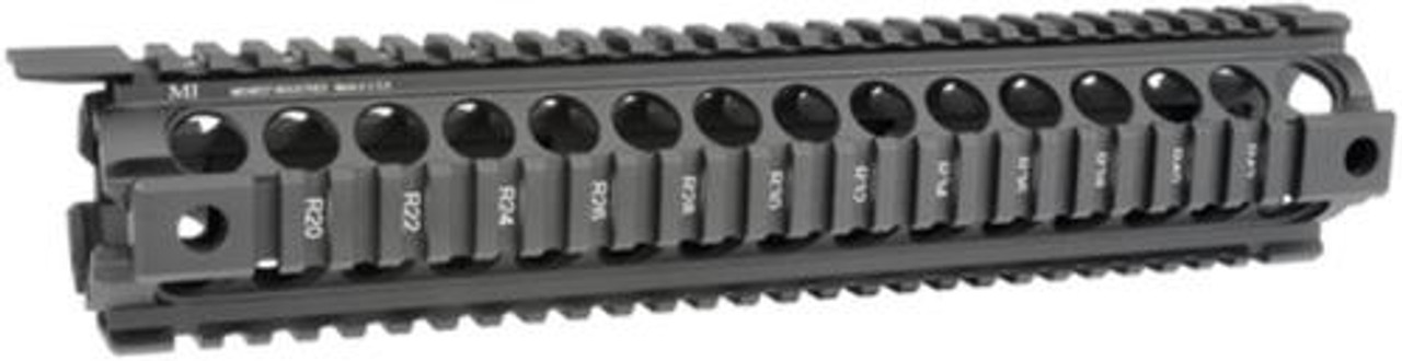 No gunsmith, drop-in installation. Designed with four anti-rotation QD sockets for push button swivels. Lightweight, solid lock-up with monolithic type continuous top rail. 1913 mil-spec rails, T-marked for accessory location. Constructed from 6061 aluminum with hard coat anodized finish. Compatible with most gas piston systems. Made in the USA.