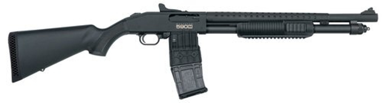 Description : Model 590M Tactical Magazine-Fed Tri-Rail 12 Gauge 2.75 Inch Chamber 18.5 Inch Barrel Matte Blue Finish Ghost Ring Sight Black Synthetic Stock 10 Round