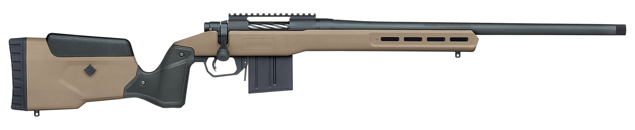 New-design Mossberg LR Hunter Monte Carlo stock has machined aluminum bedding pillars for stability, is polymer-coated in Spider Gray finish with light micro-texture for enhanced gripability