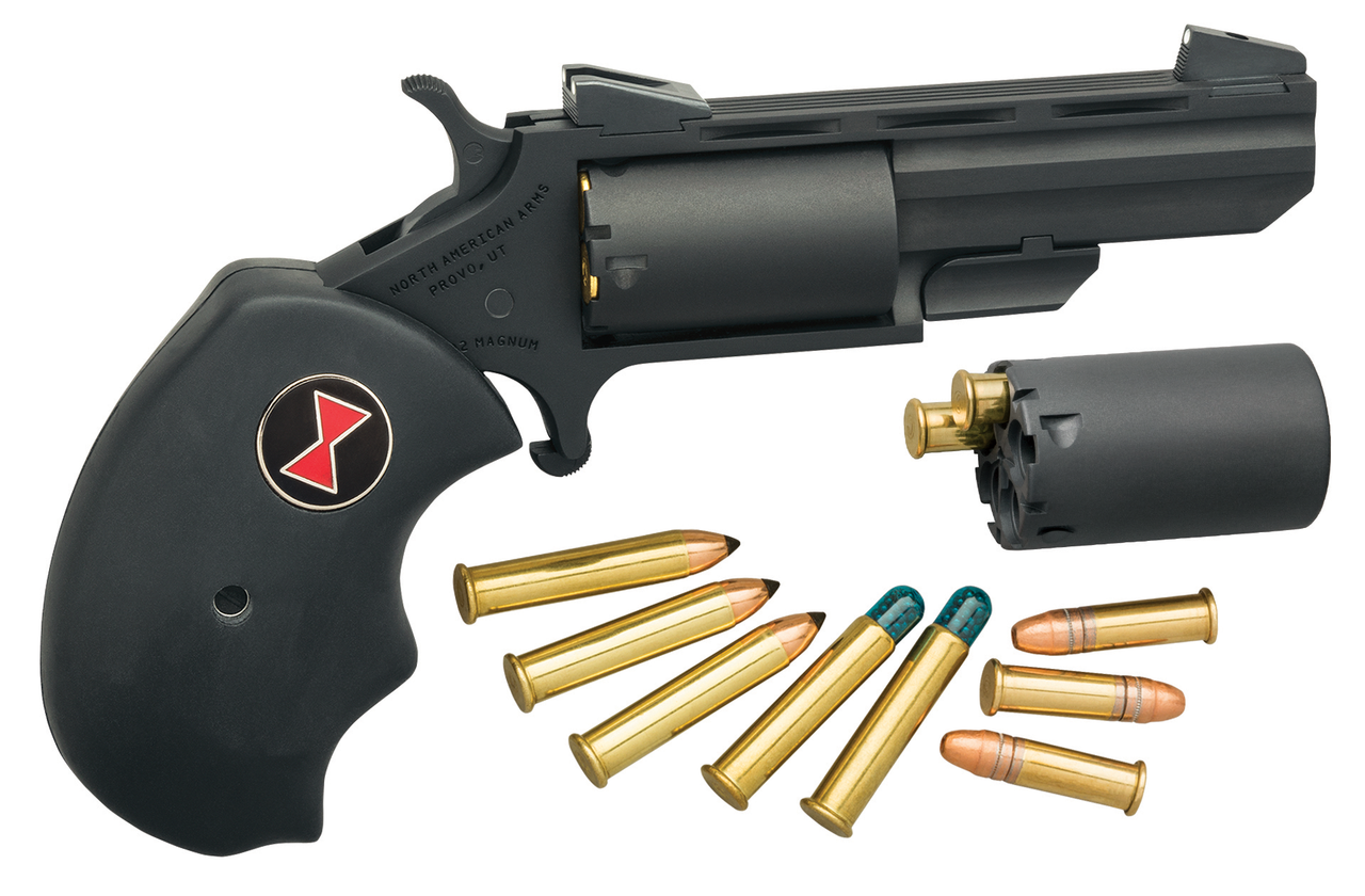 Black Widow revolvers evolved from NAA’s popular .22 Magnum frame series and include the time tested design characteristics that are incorporated in all NAA mini revolvers. The result is enhanced stability and accuracy for the shooter. The Black Widow has a heavy 2″ vent barrel, bull cylinder and fixed low profile sights by Millet. The Black Widow also features oversized black rubber grips sporting the iconic red hourglass shape found on its namesake.