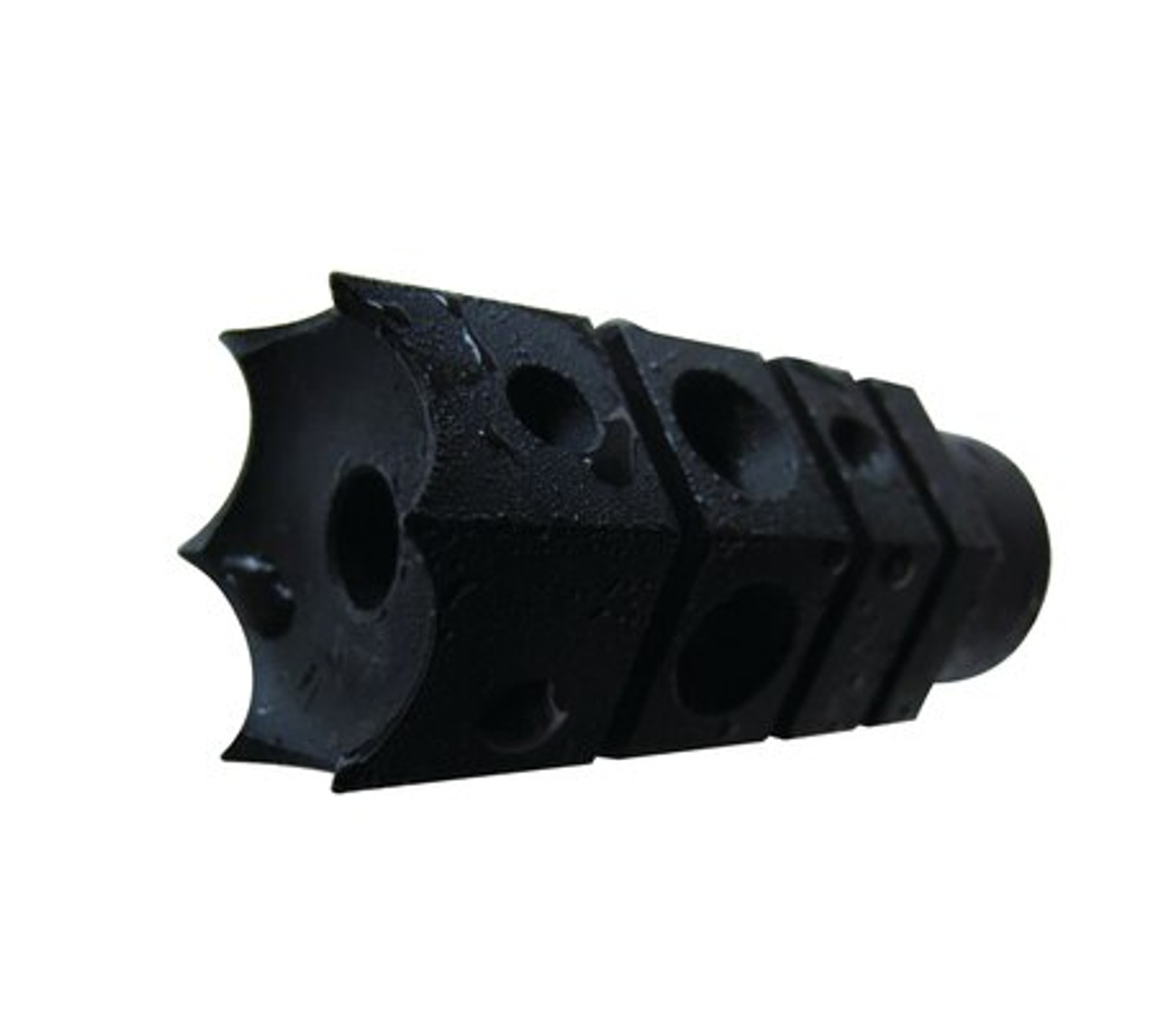 Features five side ports that are tapered outward and aggressive forward spikes that can assist the operator with situations such as breaching, breaking glass and less than lethal persuading. Length: 2 inches. Width: 1 inch. Threaded: 1/2-28 tpi. For 5.56mm/.223 Caliber. Made in the USA.