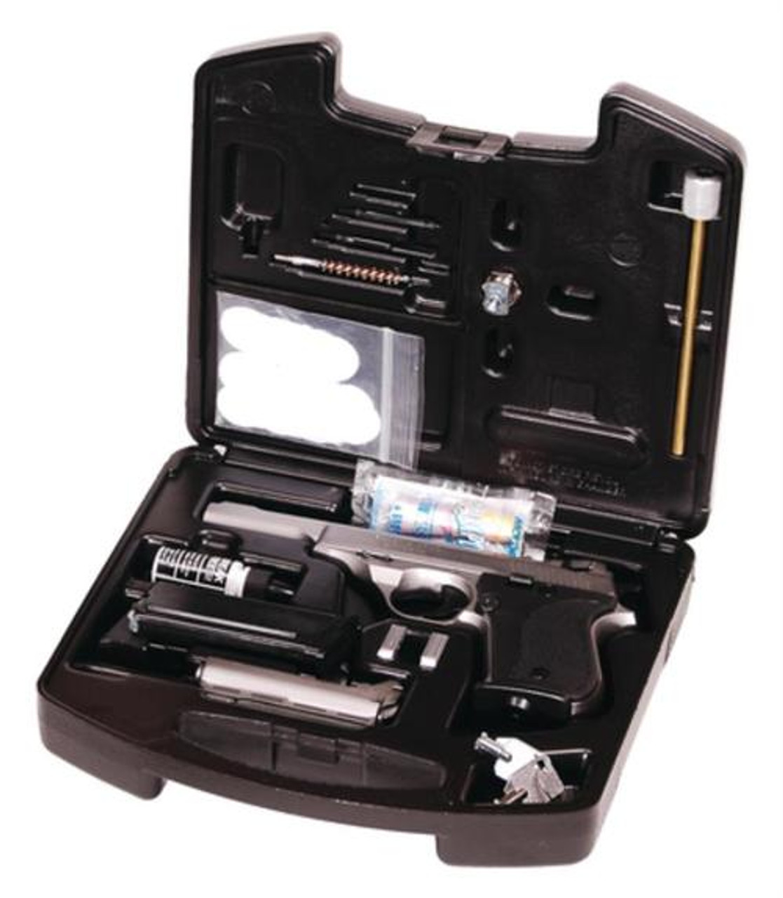 COMES COMPLETE WITH A CUSTOM FITTED LOCKING TRANSPORT CASE THAT INCLUDES CLEANING KIT, GUN OIL, AND INTEGRATED PISTOL LOCKING DEVICE.