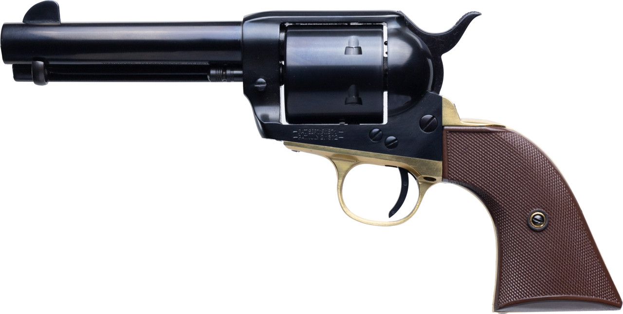 Davidson’s Exclusive: Deep Blued Finish Frame, Non-fluted Cylinder and Barrel. High-polished Brass Trigger Guard, Front Strap, and Back Strap, Two-piece Grip