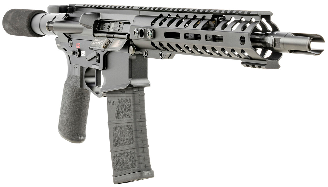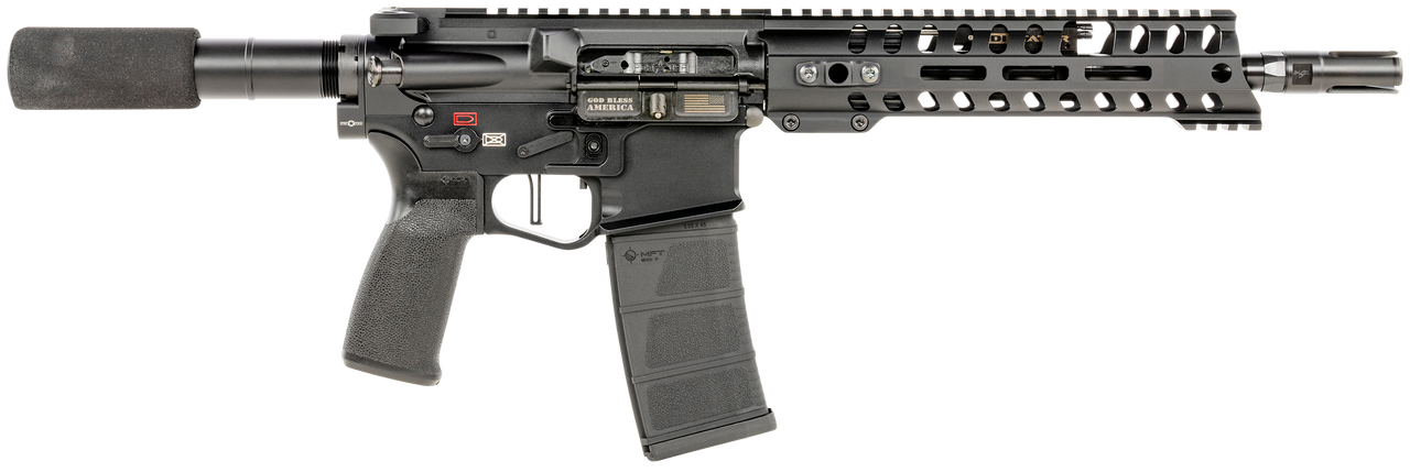 The Renegade Plus Pistol embodies everything a direct impingement AR-15 can be. POF has taken the same specs and features and condensed it into the best AR Pistol on the market. With improvements such as our roller cam pin and patented heat sink barrel nut, these upgrades go well above mere aesthetics often found in firearms today. Put simply, the Renegade Plus Pistol addresses all of the weak points of the direct impingement system. The Dictator 9-position adjustable gas block gives you ultimate control of your pistol, whether tuning for ammo load or suppressor use. The straight gas tube eliminates heat build up from the weak points of standard gas tubes. And the roller cam pin ensures a smooth and more reliable relationship with the upper receiver. The Renegade + Pistol is built off of our Gen 4 billet lower receiver. This receiver is completely ambidextrous and includes our flat 3.5 lb match grade trigger with KNS Precision anti-walk pins. The Renegade + Pistol comes with our M-LOK compatible Renegade rail, covering the 10.5 nitride heat-treated barrel.