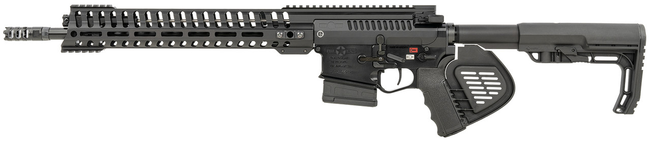 such as charging handle, bolt carrier, cam pin, buffer, heat sink barrel nut, handguard, and 5-position gas piston operating system. The barrel extension, bolt assembly, upper, and lower receiver are the exact same size as those on an AR15. Weighing in at 7.3 lbs. the Revolution features their new Edge Handguard with four built-in QD mounts, and is packed with all you’ve come to expect from POF-USA. Fully ambidextrous billet receiver set, nickel plated carrier, 5-position adjustable gas piston, single stage match grade trigger, and With their triple port muzzle brake recoil management is not an issue.
