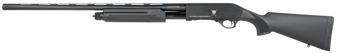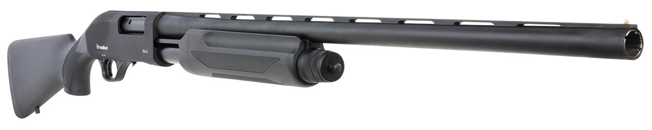The pump action Radikal PA-2 features a 7075-T6 aluminum receiver, polymer hard case forend, and 4140 steel barrel/bolt. Its barrel uses MobileChoke tubes and has a black chrome finish.