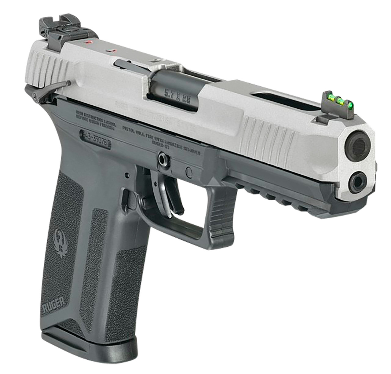 The Ruger-57 features impressive ergonomics which include an easy trigger reach, 1911-style ambidextrous manual safety, robust slide release and reversible magazine release latch. Through hardened, billet steel slide with lightening cuts is drilled and tapped for easy mounting of optics. The alloy steel barrel features a nitride treatment for wear resistance, while the textured, ergonomic frame provides a secure and comfortable grip. It utilizes Ruger’s safe, reliable and proven Secure Action fire-control system that combines a protected internal hammer with a bladed-safety trigger. The trigger has a short, smooth pull, clean break and positive reset. Safety features include: 1911-style ambidextrous manual safety; an integrated trigger safety; light-weight firing pin; neutrally balanced sear; and hammer catch. The Ruger-57 also features inspection port and Picatinny-style accessory rail for easy mounting of lights and lasers.