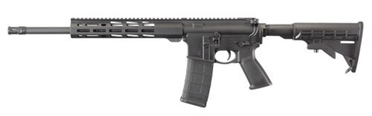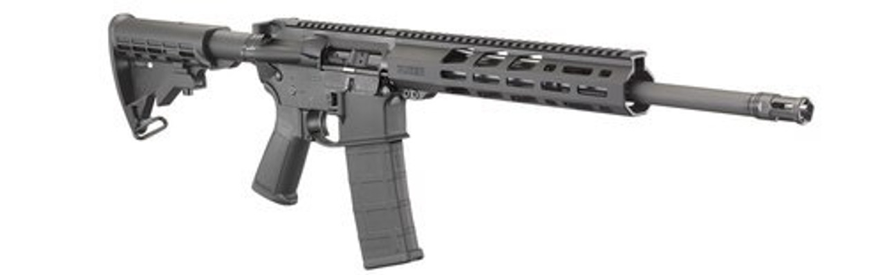 This Ruger AR-556 semi-automatic rifle is made from forged aerospace-grade 7075-T6 aluminum. The hard coat anodized, flattop upper receiver includes a forward assist, dust cover and brass deflector, while the Magpul M-Lok handguards are made from heat-resistant glass-filled nylon. It also has a bolt machined from 9310 alloy steel, single-stage trigger, chrome-plated bolt carrier with a matte black oxide finish on the exterior. The AR-556 also utilizes a heavy contour, cold hammer-forged barrel and ergonomic pistol grip.
