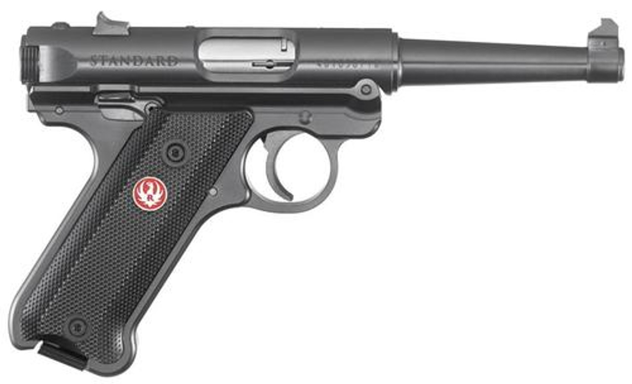 Ruger’s Mark IV Standard features a simple, one-button takedown for quick and easy field-stripping and proper chamber to muzzle cleaning. A recessed button in the back of the frame allows the upper receiver to tilt up and off of the grip frame without the use of tools. The one-piece, precision CNC-machined grip frame has a smoothly contoured, grip with natural pointing grip angle with replaceable, checkered grip panels for a non-slip hold. Its internal cylindrical bolt construction ensures permanent sight to barrel alignment and higher accuracy potential than conventional moving slide designs. The contoured ejection port and easy-to-grasp bolt ears allow for durable and reliable operation. Its sighting system features fixed sights and is drilled and tapped receiver for Weaver or Picatinny-style rail for easy mounting of optics. The Mark IV Standard also features a push-button magazine release on the left side of the frame, ambidextrous manual safety, and two 10-round magazines.
