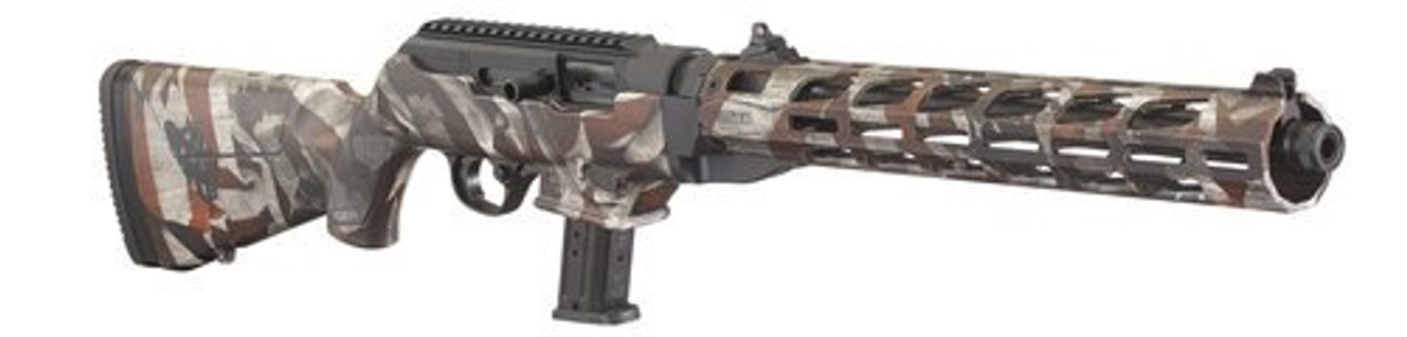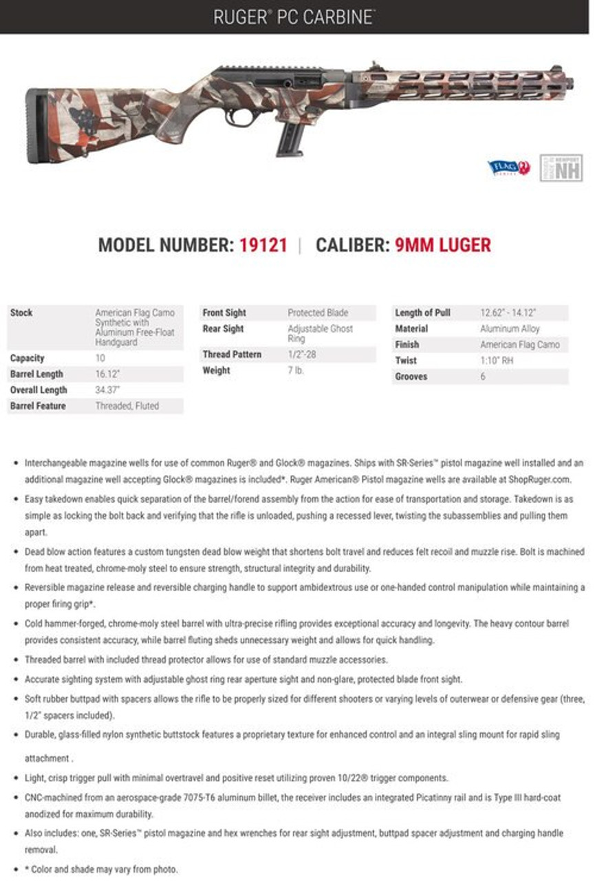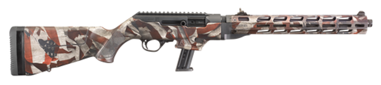 The Ruger PC Carbine features American Flag Camo with an integrated Picatinny-style rail and in Type III hard-coat anodized for maximum durability. Features a threaded barrel with included thread protector that allows for use of standard muzzle accessories; interchangeable magazine wells for use of common Ruger and Glock magazines. Ships with SR-Series pistol magazine well installed and an additional magazine well accepting Glock magazines is included; accurate sighting system with adjustable ghost ring rear aperture sight and non-glare, protected blade front sight; Soft rubber buttpad with spacers allows the rifle to be properly sized for different shooters or varying levels of outerwear or defensive gear; durable glass-filled nylon synthetic buttstock features a proprietary texture for enhanced control and an integral sling mount for rapid sling attachment; light, crisp trigger pull with minimal overtravel and positive reset utilizing proven 10/22 trigger components and the heavy contour barrel provides consistent accuracy, while barrel fluting sheds unnecessary weight and allows for quick handling. Includes one SR-Series pistol magazine, three 1/2″ spacers and hex wrenches for rear sight adjustment, buttpad spacer adjustment and charging handle removal.