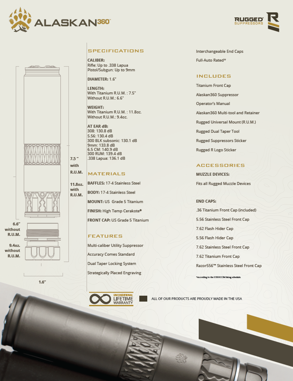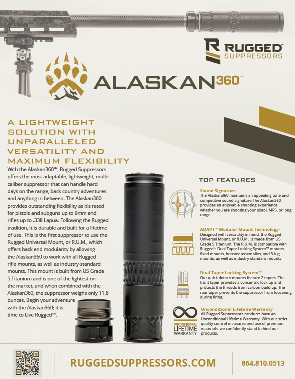 With the Alaskan360, Rugged Suppressors offers the most adaptable, lightweight, multicaliber suppressor that can handle hard days on the range, back country adventures and anything in between. The Alaskan360 provides outstanding flexibility as it’s rated for pistols and subguns up to 9mm and rifles up to .338 Lapua. Following the Rugged tradition, it is durable and built for a lifetime of use. This is the first suppressor to use the Rugged Universal Mount, or R.U.M., which offers back end modularity by allowing the Alaskan360 to work with all Rugged rifle mounts, as well as industry-standard mounts. This mount is built from US Grade 5 Titanium and is one of the lightest on the market, and when combined with the Alaskan360, the suppressor weighs only 11.8 ounces. Begin your adventure with the Alaskan360; it is time to Live Rugged.
