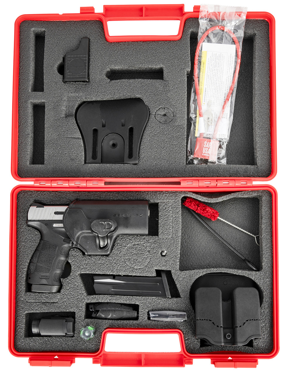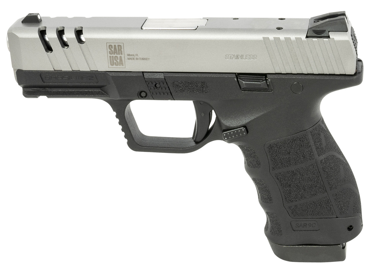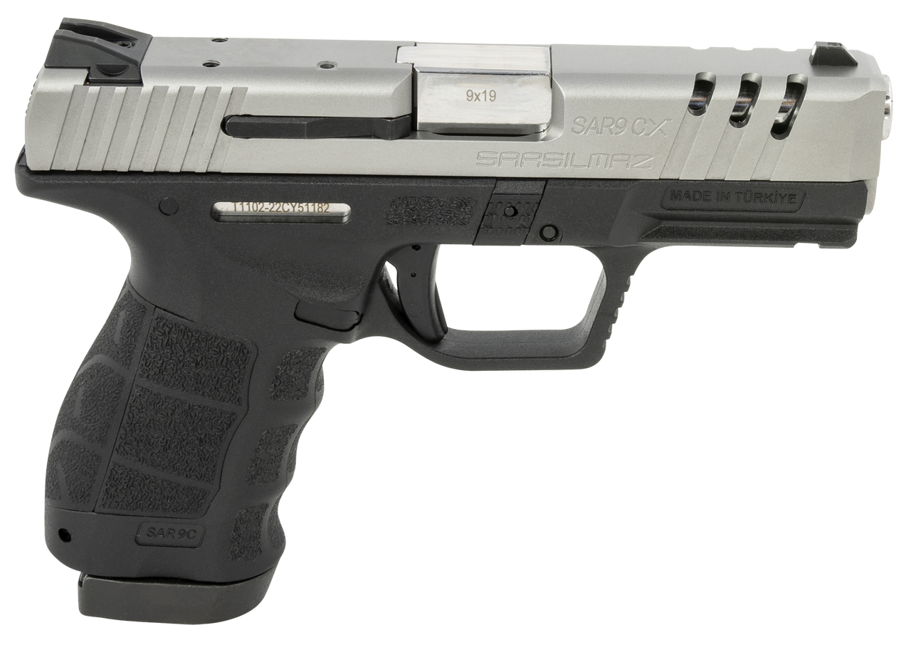 The SAR9 Compact X (SAR9 CX) is the ultimate package. The X package features two 15 round magazines with a full assortment of accessories including holster, magazine pouch, magazine loader and rail mounted flashlight. Additional features include front lightening serrations on the slide for reduced weight and our buttery smooth safety trigger which is a standard on all SAR9 models. The SAR9 CX package has it all and is ready for the range right out of the box.