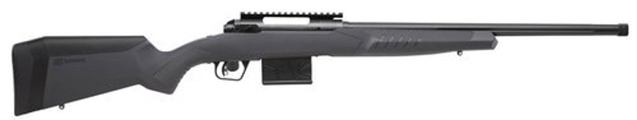 This left hand 308 Winchester model has a 24″ matte black heavy barrel with threads. It also has a gray finish stock.
